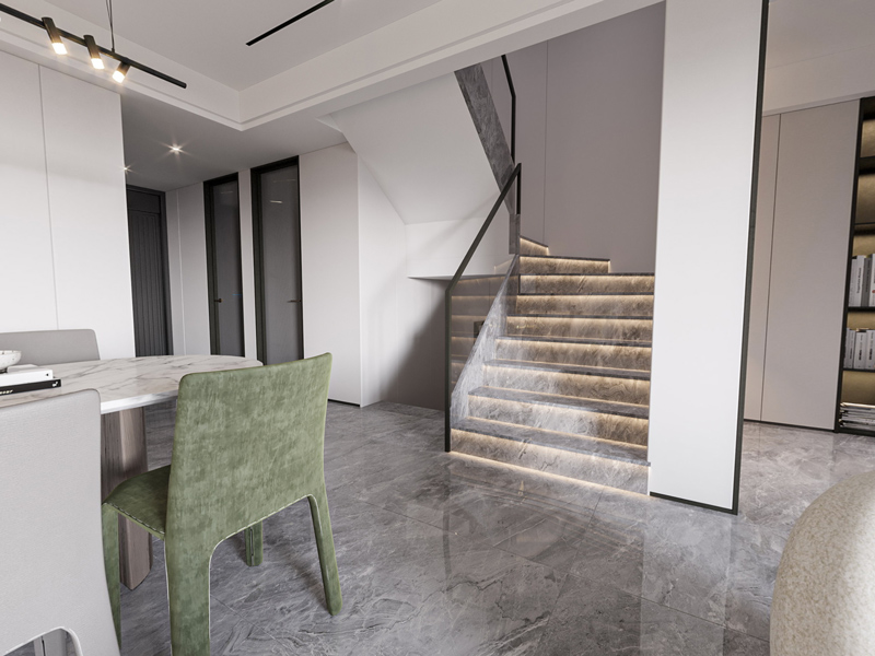 楼梯灯带设计,美观又安全,方便上下楼,空间通透,灰色大理石地面搭配白色墙面,清新自然。