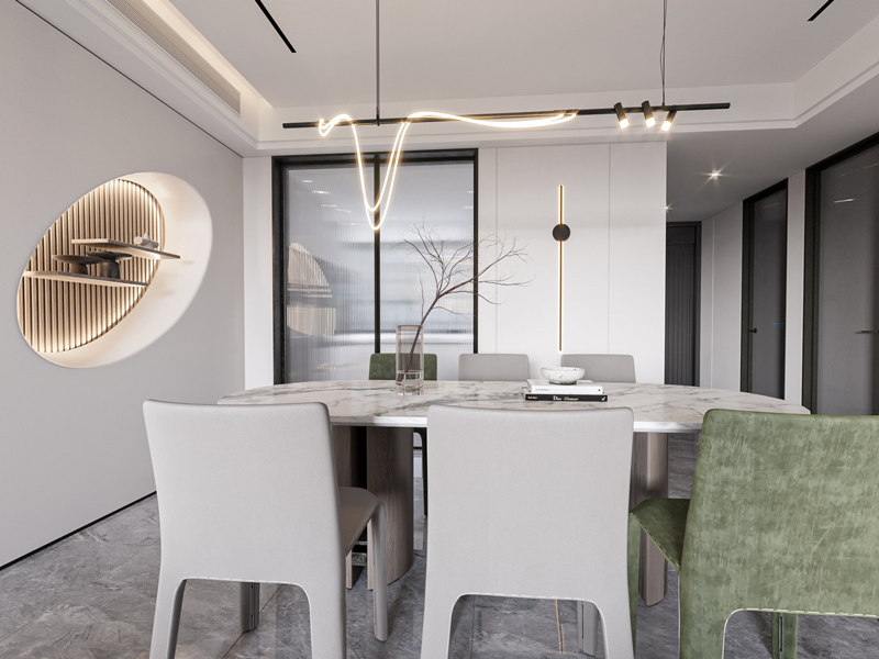 个性吊灯与圆洞得墙面设计独特,时尚大气,开放式布局,营造温馨和谐用餐氛围,撞色灵动避免单调。