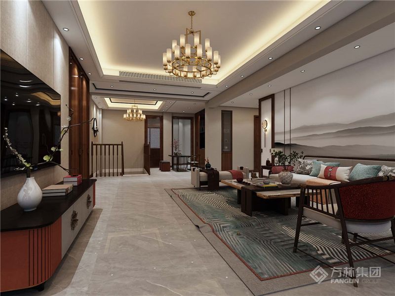 中国风的构成主要体现于传统家具、装饰品及黑、红为主的装饰色彩上。室内多采用对称式的布局方式,格调高雅,造型简朴优美,色彩浓重而成熟。