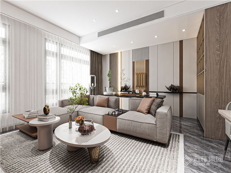 "厅整体设计采用全屋围合方案,顶天立地, 墙板与门与柜子浑然一体,不是表面的富丽堂皇, 而是骨子里内敛低调的气质。"