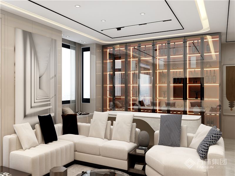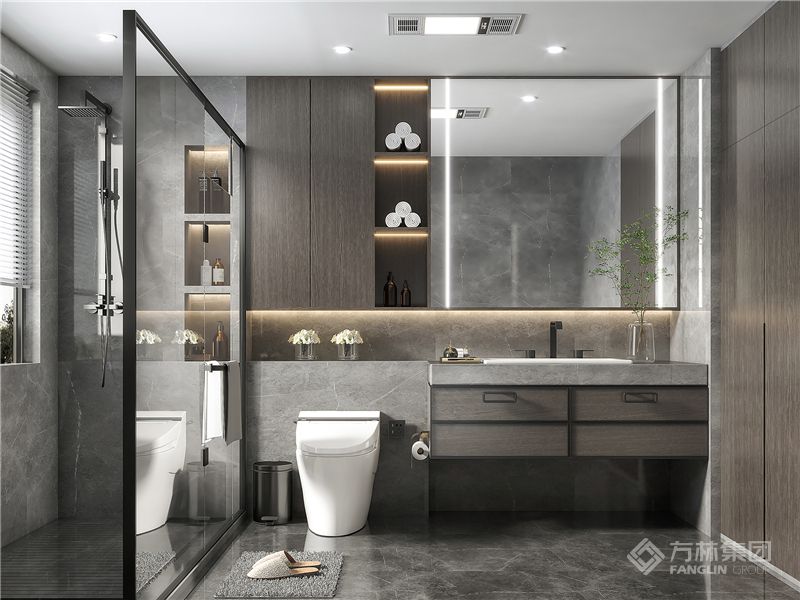 本案风格定位为意式极简,空间含蓄,以简胜繁。主体为暖白色,点缀木色增加自然舒适的氛围。用线灯条代替主灯,给人以简洁与时尚元素,本案例采用石材替代瓷砖的手法让空间更加自然逼真.